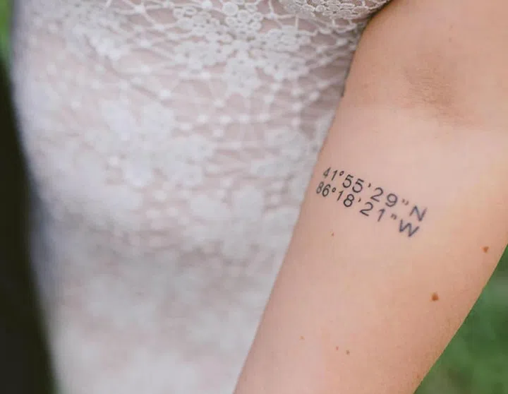 Remember your special day with a tattoo of the longitude and altitude of the place you and your spouse said “I do”.