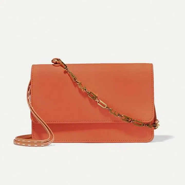 This shoulder bag from Jacquemus is seen in a zingy orange hue and crafted from butter-soft leather. The shoulder strap is detailed with gold letter charms that spell out the brand’s name. The envelope clutch silhouette is sleek and slim, but don’t let the facade deceive you. The interior of the bag is spacious enough to store all your ang paos, phone and other essentials.