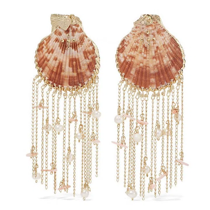 Featuring oversized faux seashells in a stunning russet colour, these earrings are replete with dangling gold-tone chains that laced with glossy faux pearls and resin beads that mimic the look of dainty pink corals.