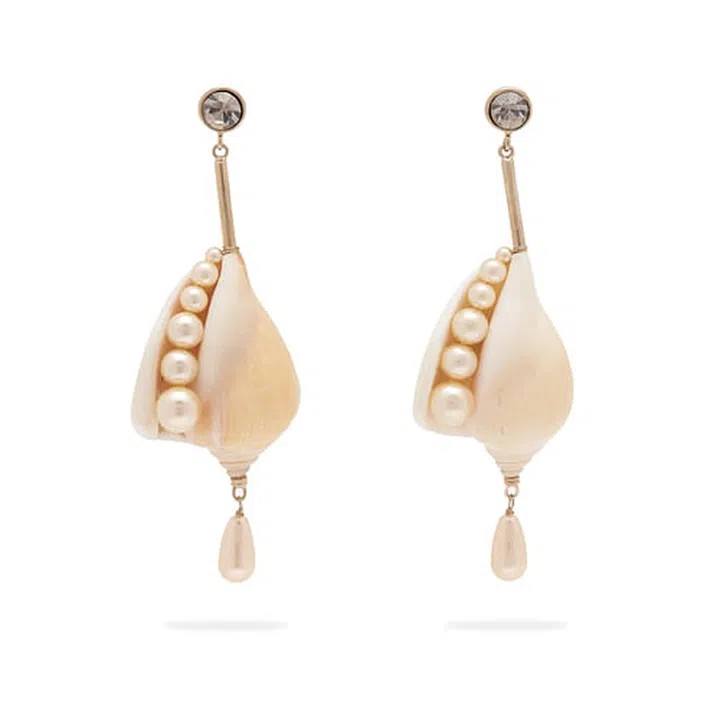 For Etro's SS19 collection, seashells were a key motif. Highlighting the brand’s opulent bohemian aesthetic, these imitation pearl encrusted conch shell earrings were crafted in Italy.