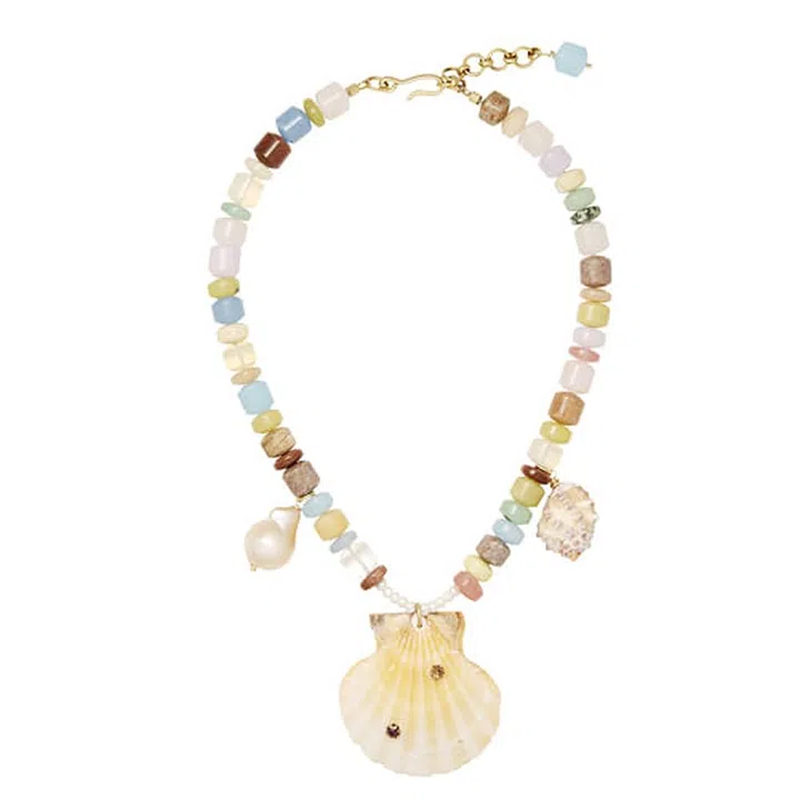 Reminiscent of the rainbow macaroni necklaces from our childhood, this throwback necklace features a Swarovski gem-punctured drupe shell taking the spotlight.
