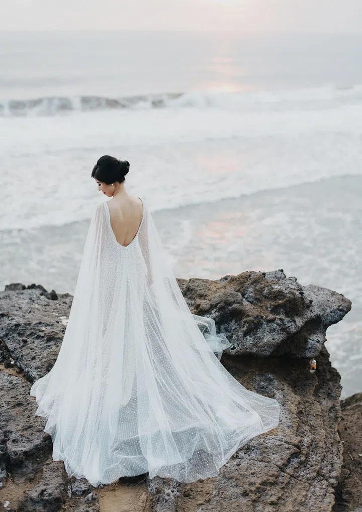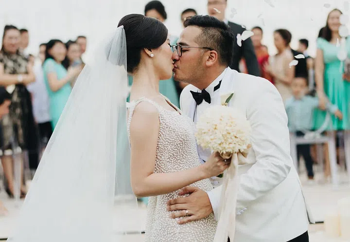 For Vivi and Yoga's beautiful seaside wedding at the Soori Bali villa resort, the couple wanted a celebration that would blend beautifully with its design and surroundings. "Our planner, Nastassya Saputra of Flying Bride, combined natural, sea-themed elements, such as luminous oyster and capiz shells, with rows of dramatic candles to dress up the long banquet tables. And, as we're both not fond of flowers, the decorators used exotic succulents, which I love, as centrepieces. They also hung rows and rows of terrarium-style crystal lamps that the entire venue a glowing elegance."