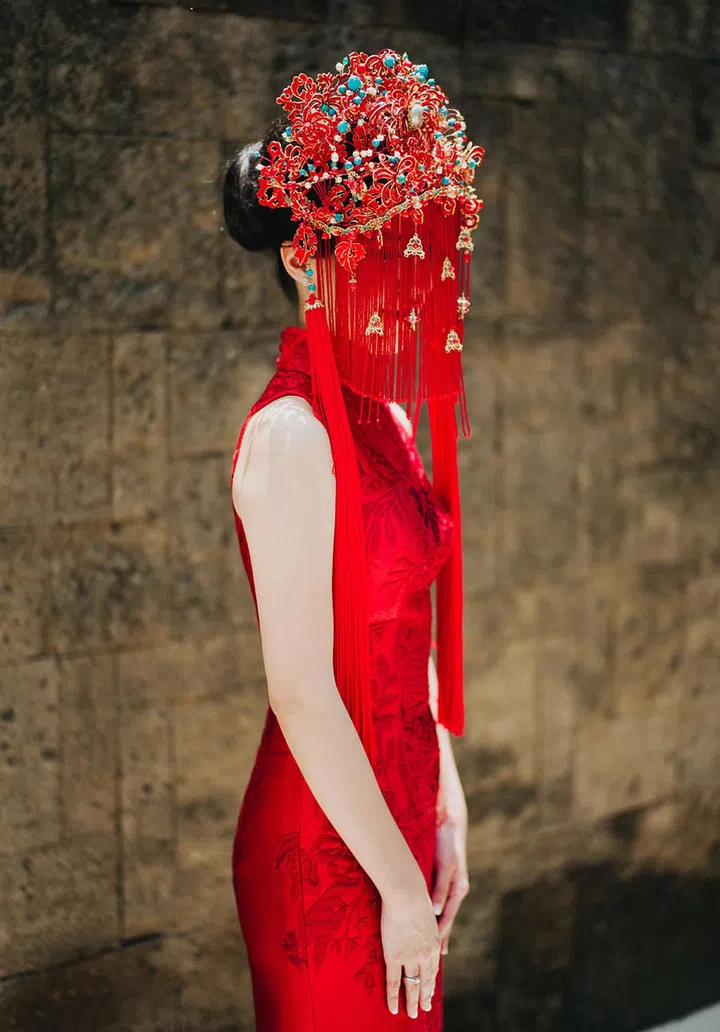 Auspicious red: The bride donned a traditional Chinese bridal headdress, along with a crimson cheongsam with intricate embroidery.