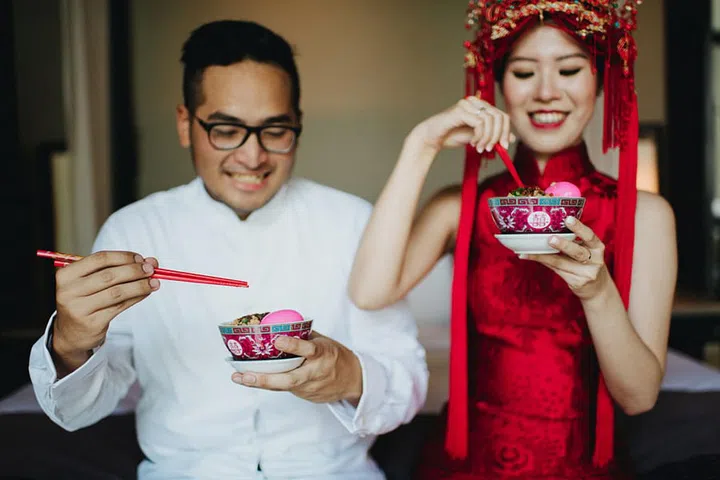 Eating glutinous rice balls on the wedding day signifies a sweet marriage as well as wholeness (as the rice balls are round in shape).