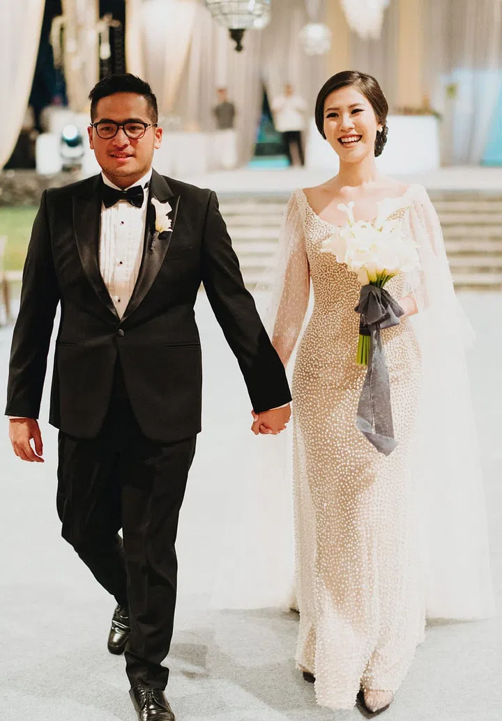 For the banquet, Yoga donned a black tux while Vivi amped up her sleeveless white gown from the ceremony with a sheer cape, and held a clutch of pristine white calla lilies.