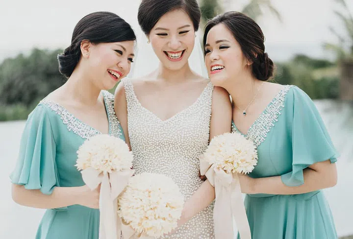 Vivi's bridesmaids were dressed in mint gowns with embellishments that matched those of her dress.