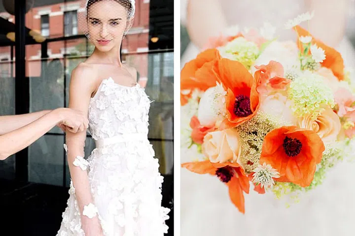 The bouquet: A burst of bright cheery hues instantly gives your ensemble a dose of playfulness. Bright orange anemones like these might prove difficult to get in Singapore, but you can also try alternatives like Gerbera daisies, roses, ranunculuses and alstroemeria for that vivid pop of colour.