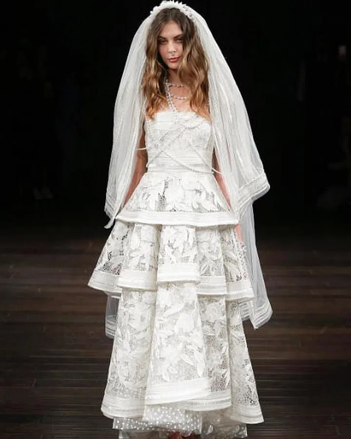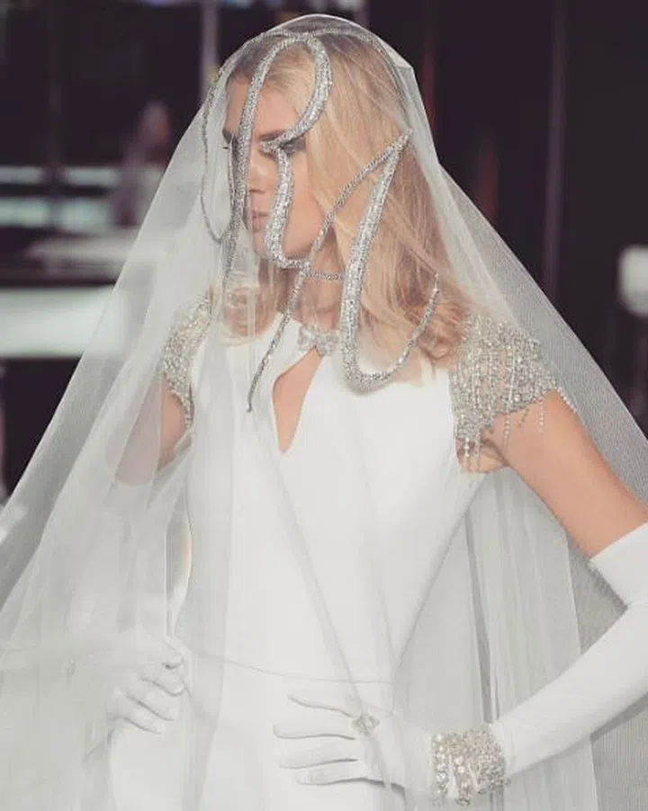 He continues on with this twist from bridal trends with this flapper-esque number with a hand embroidered metallic threadwork veil that won’t look out of place in a Game of Thrones episode.