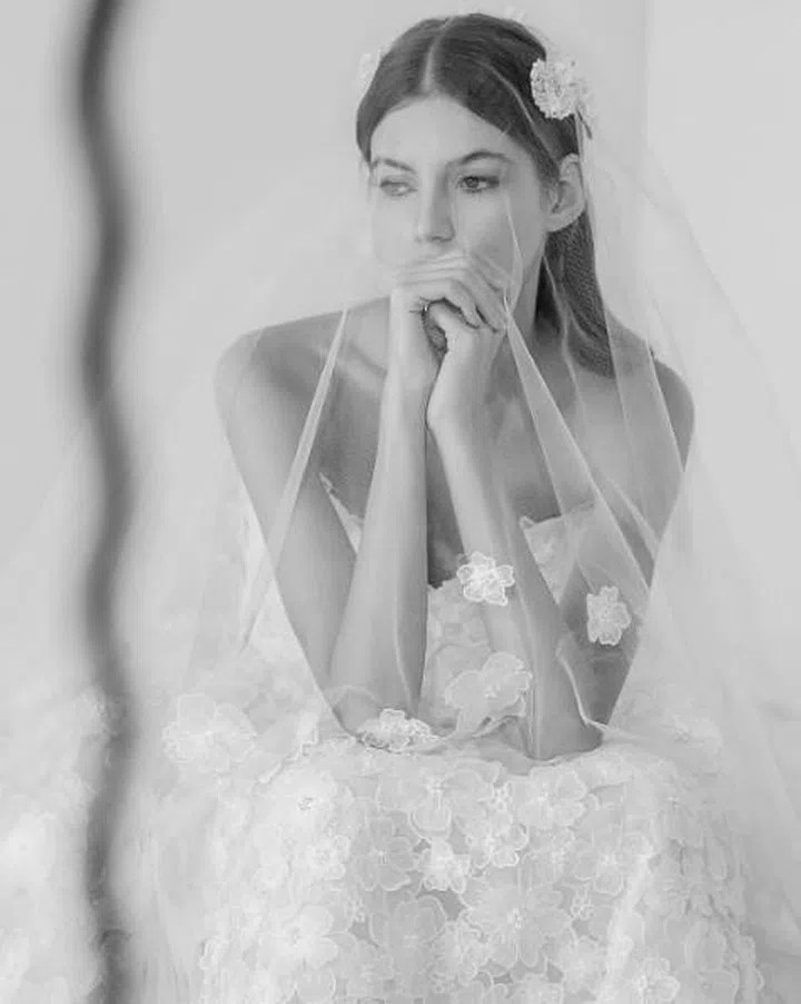 From Elie Saab’s Ready-Wear Bridal Fall 2017, this bridal veil with individual floral appliques inspired by the Japanese cherry blossom is beauty in simplicity personified.