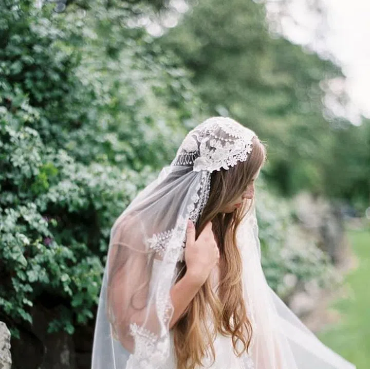 This bohemian veil in the Juliet cap style is wonderfully romantic, and will go perfectly well with soft, billowy lace wedding gowns.