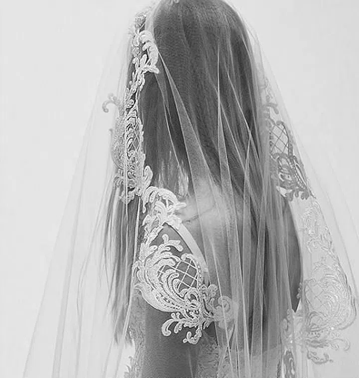 Her use of black wedding gowns, heavy embellishments were all atypical, and this bridal veil with initials scrawled across the front is definitely a modern idea and unconventionally glamorous.