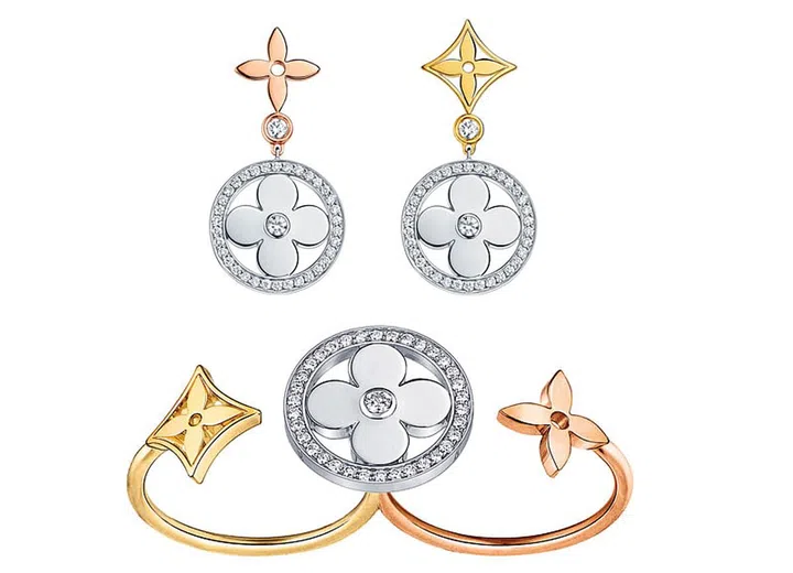 Modern brides will love Louis Vuitton’s latest New Blossom collection in luminous white mother-of-pearl or sparkling diamonds. The Idylle Blossom collection features the Monogram Flower in the beautiful sheen of yellow, white and pink gold along with diamonds, and stylish mix and match options for the rings - a feminine and pretty selection for brides.