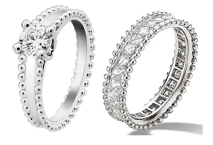 The Estelle Solitaire engagement ring and matching wedding bands are inspired by the fairytale love story of Alfred Van Cleef , one of the founders of Maison Van Cleef & Arpels, and Estelle Arpels, his wife. The elegant rings feature delightful gold pearl contours that enhance the dazzling sparkle of brilliant diamonds. The solitaire diamond engagement ring, paired with either of the matching wedding bands, like the Estelle Diamond Paved Eternity wedding band, is a perfect and flawless match of beauty and romance.