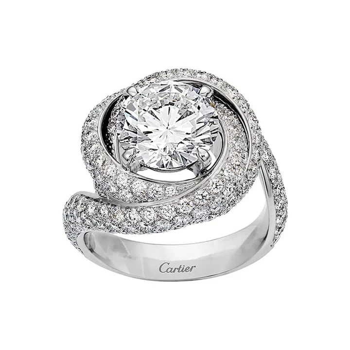 Inspired by the iconic Trinity de Cartier, the Trinity Ruban engagement or anniversary ring truly transcends the trendy styles of today. Celebrating the infinite connection of an eternal bond, its setting – a swirling diamond-paved ribbon of platinum around a central brilliant-cut diamond – represents unending love.