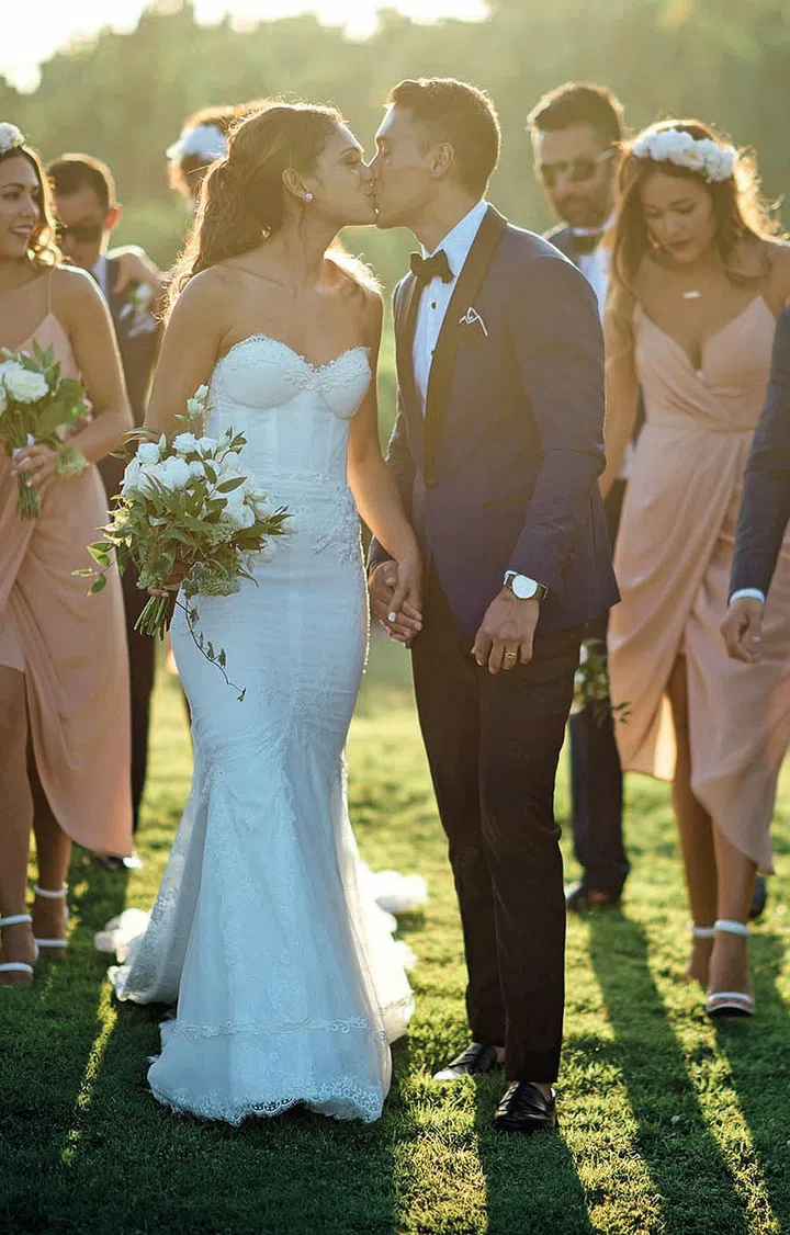 Real bride Courtenay rocked a figure-skimming Inbal Dror couture dress for her garden wedding. The dress was perfect with a chapel train and delicate lace detailing and scattered crystal embellishment.