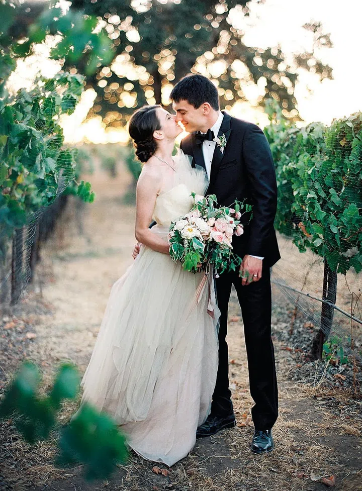 We’re falling for this blush-tinged Carol Hannah tulle dress worn by Ruxandra that complemented her rustic celebration at the Susntone Winery. This dress couldn’t possibly be more fitting for a breezy outdoor garden wedding.