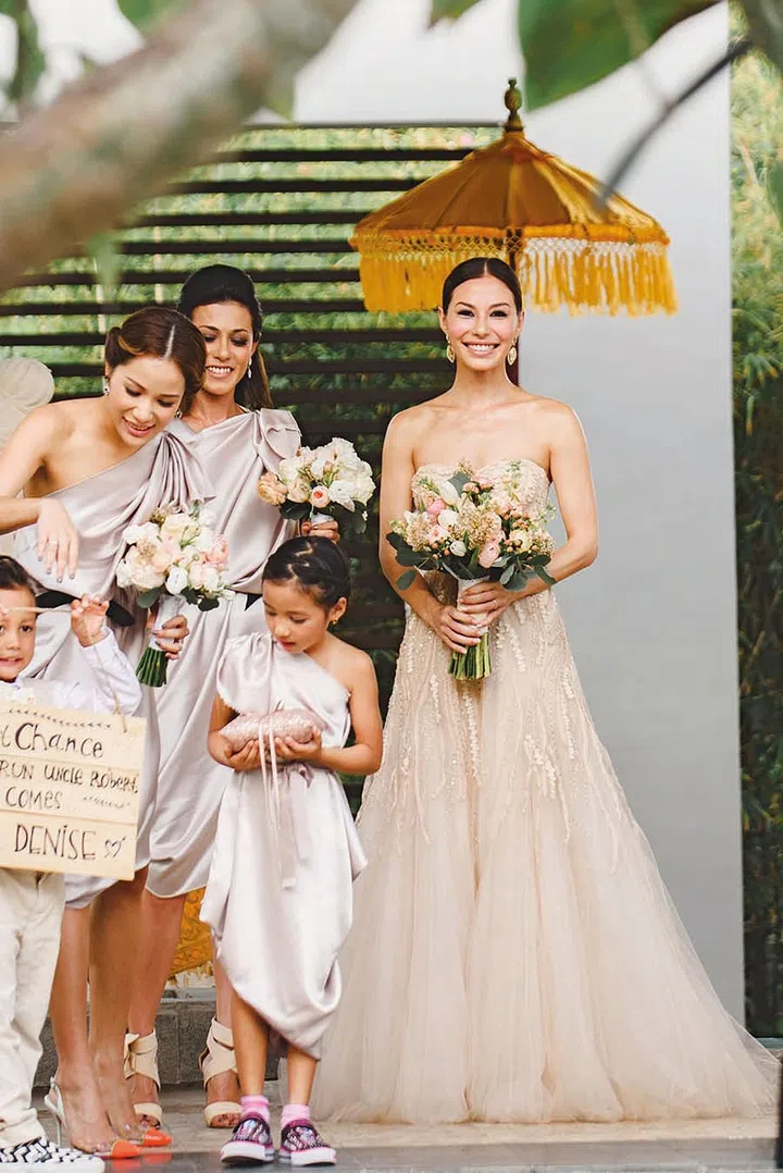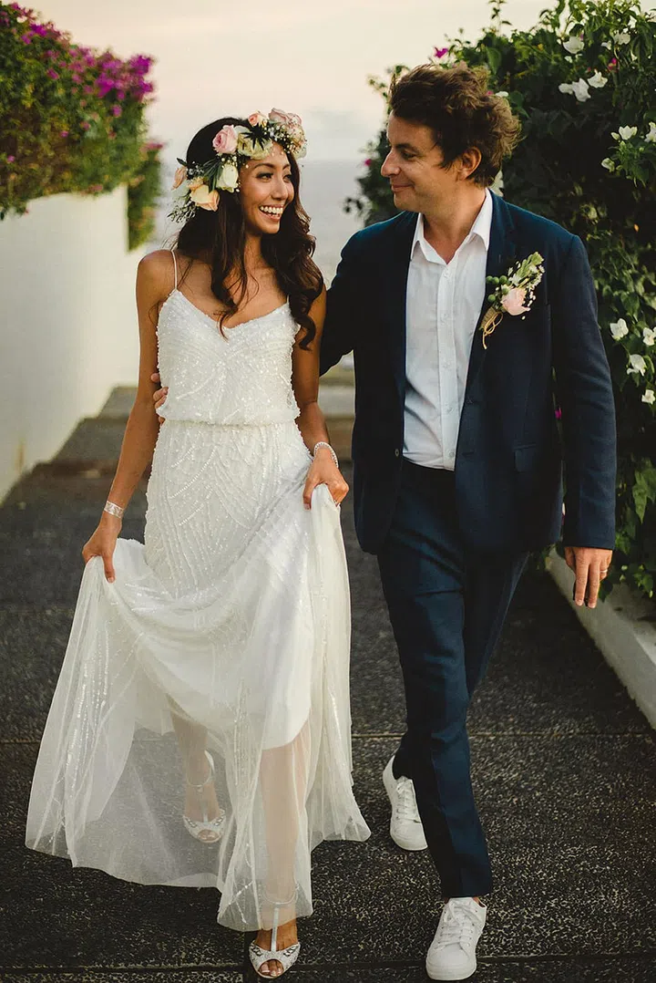 Casual and charming, Farrah donned a lightweight chiffon sequinned gown for her laidback tropical-themed wedding in Bali and matched it with a vibrant flower crown.