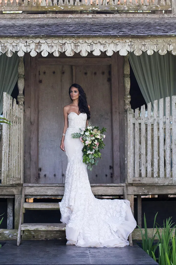 Real bride Sepideh exuded sexiness and femininity in a spectacular Inbal Dror with a sweetheart neckline for her magnificent Balinese ceremony!