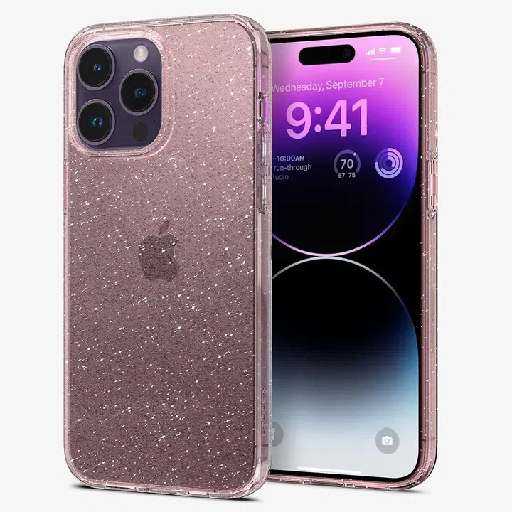 The Spigen iPhone 14 Pro Max Case Liquid Crystal Glitter in Rose Quartz features a transparent back panel with rose quartz coloured glitter embedded inside, creating a sparkling effect.