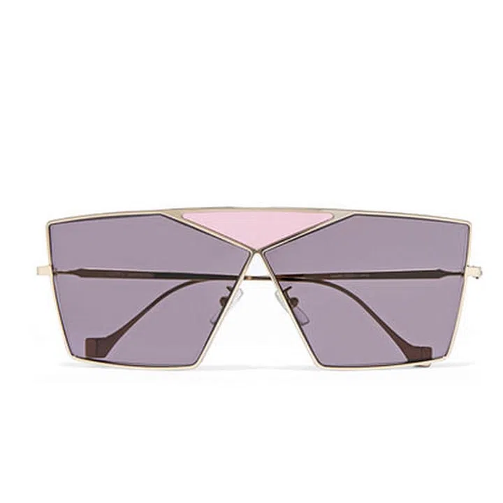 An example is Loewe’s Puzzle sunglasses, named after the brand’s prized Puzzle bag. Showcasing a square-ish shape with angular cuts, these sunglasses mimic the fun geometric silhouette of the Puzzle bag. The modish deep purple and light pink lenses, that also provide 100% UV protection, lend to it a girlish charm.