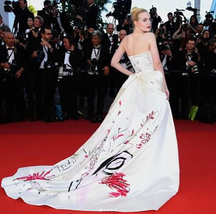 Elle Fanning's otherwise classic white ballgown was given whimsical hand painted details by none other than Vivienne Westwood herself.