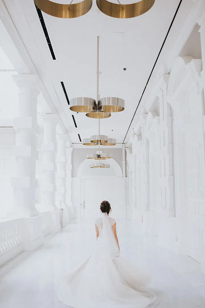 A timeless wedding portrait of the bride down the hallway of National Gallery Singapore.