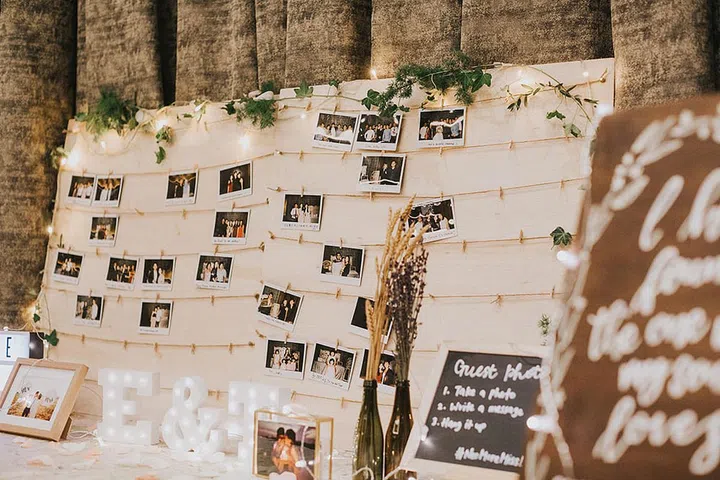 Fairylights, strands of twin and dried flowers prettily adorning their photo corner for their guests.