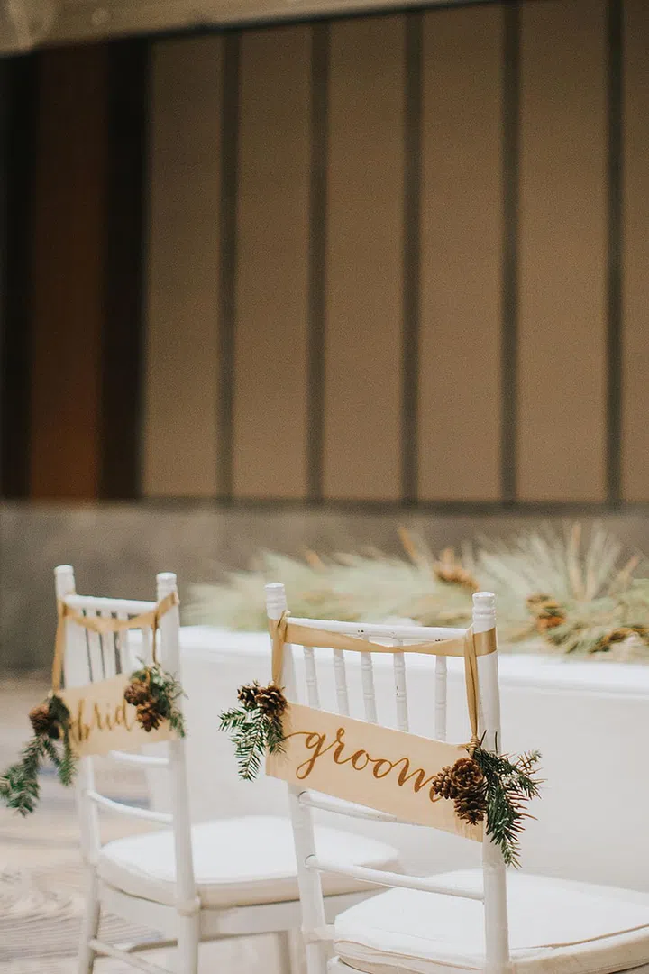 His and Hers chair decorated with gold ribbons and dried acorns.