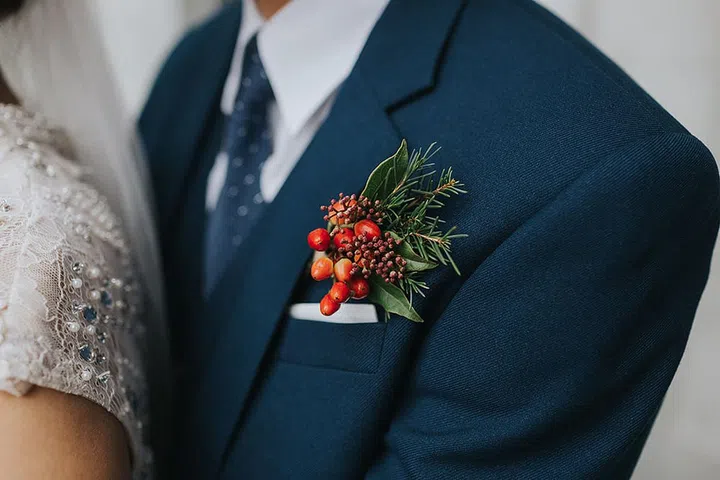 Even the groom's boutonnière was Christmas-inspired. The reds of the mistletoe stood out even more so with Eugene's dapper navy blue suit.