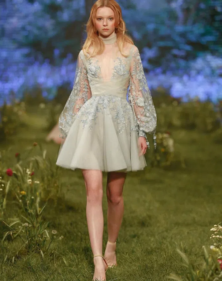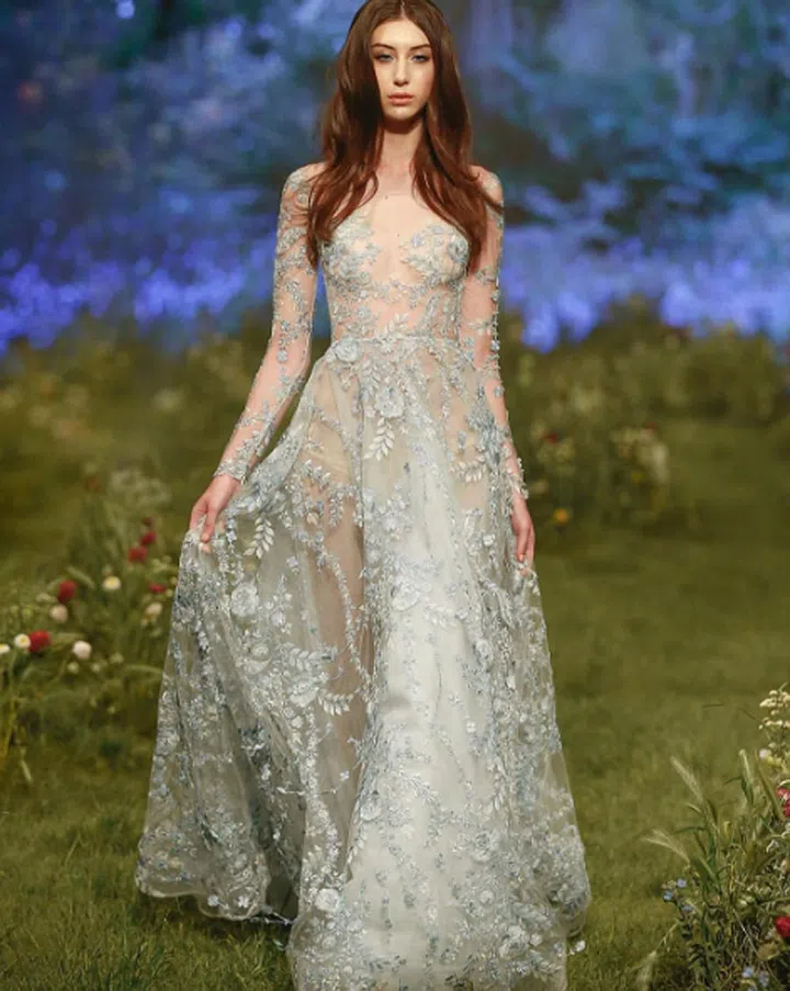 Flower chains have us thinking of fairytale storybooks and the like, which Paul Vasileff translate into this enchanting blue number.