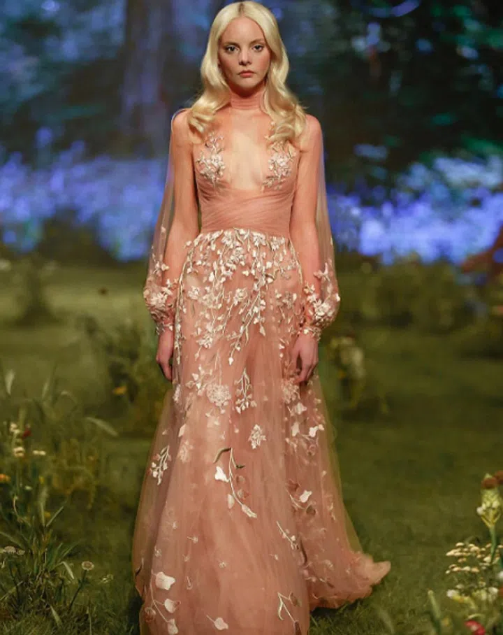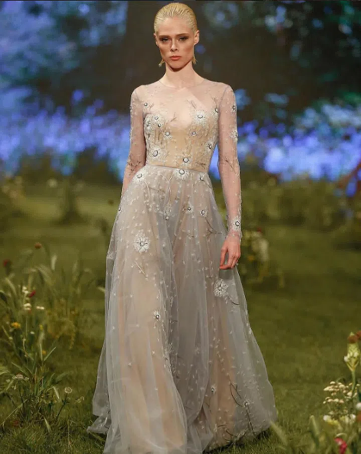 A nod to the dandelion, delicate blooms drift down the length of this ethereal blue and nude tulle number to a mesmerising effect.