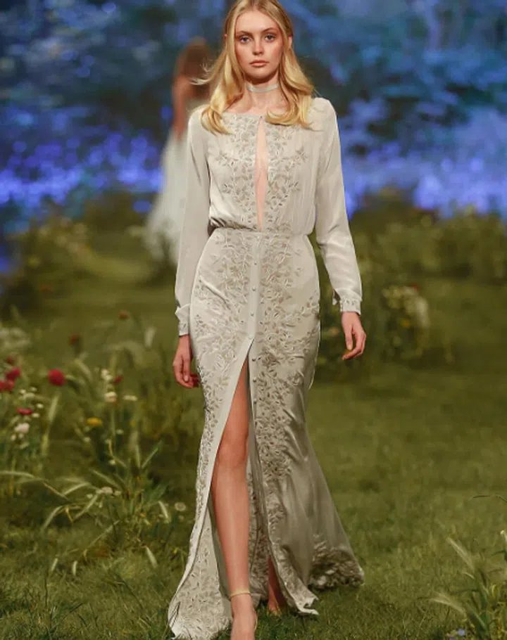 Voluminous bishop sleeves, a high choker-style neckline and exquisitely embroidered blooms looks utterly romantic and modern.