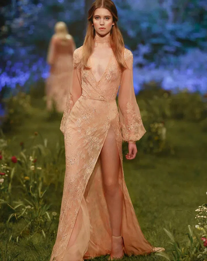 The key to baring skin tastefully is balance. Case in point: This blush number with a plunging and thigh-high slit manages to look dreamy and elegant thanks to flowing layers, and exquisite floral details.