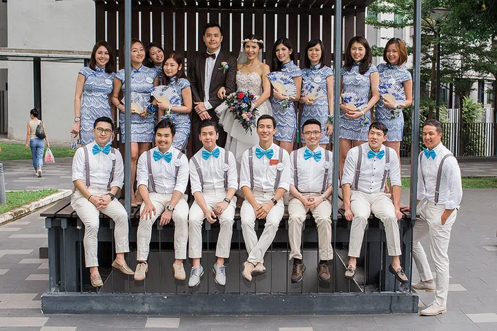 The bridesmaids had matching cheongsams and fans while the groomsmen were in bowties and suspenders.