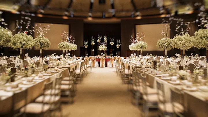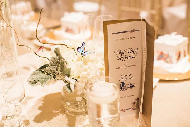 The couple worked into Capella Singapore's grand ballroom a magical Alice In Wonderland theme: from their reception area to the table decor and to the bride's girlish and ethereal wedding gowns.