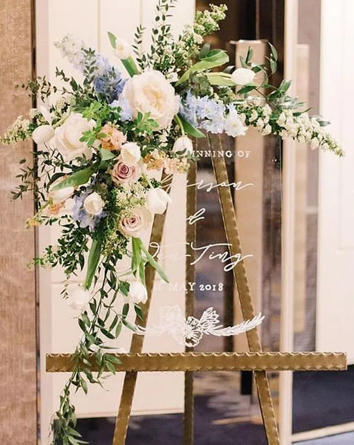 Acrylic decor works especially well for elegant, contemporary weddings. We like how versatile it is as it works well with wedding themes across the board, from chic, minimalist weddings to rustic, flower-filled ones like this arrangement done by Lavender Love Florist.