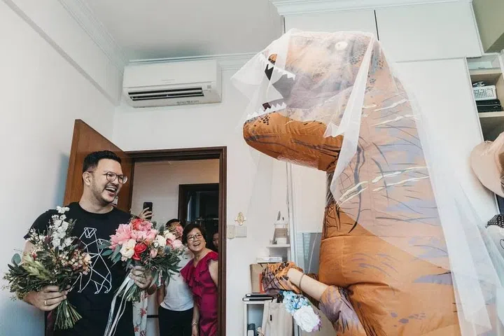 This lucky groom (who prepared not just one, but two bouquets) was greeted by a prehistoric beauty during their gatecrash. Always fun when the couple has a sense of humor!