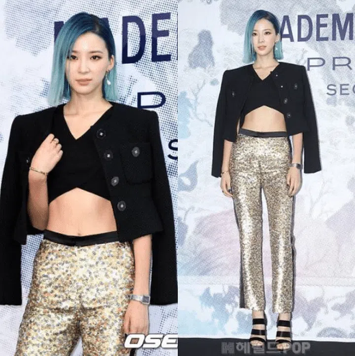 What’s a party without some sparkle? Model Irene Kim stepped out in a pair of high-waisted gold sequin pants and paired it with a black midriff top and a classic black Chanel tweed jacket.
