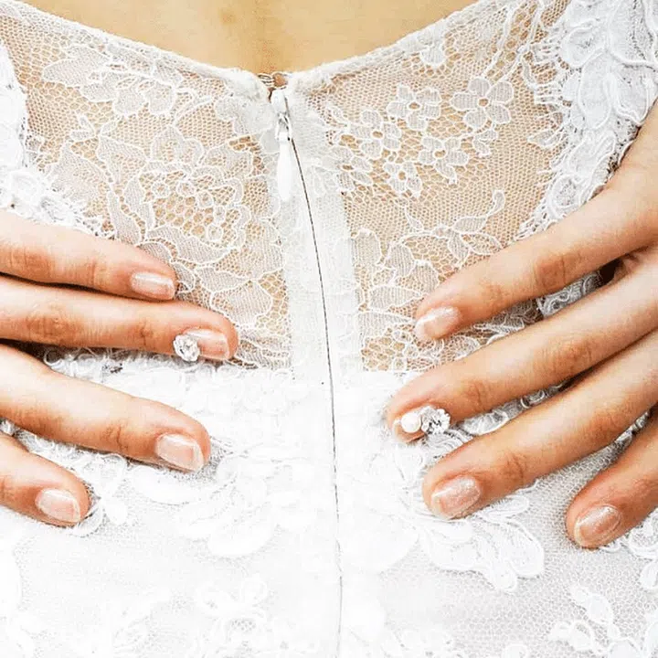 We love this: Clear glossy digits, with crystals and pearls embedded on your ring finger, for thta minimalist yet classic appeal.