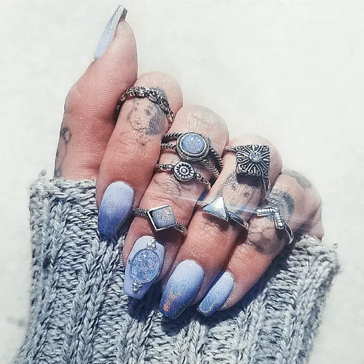 A dash of glitter, a lilac ombre base and handcrafted 'gems' translate into this stunning manicure that goes beautifully with ornate rings and a boho-style dress.
