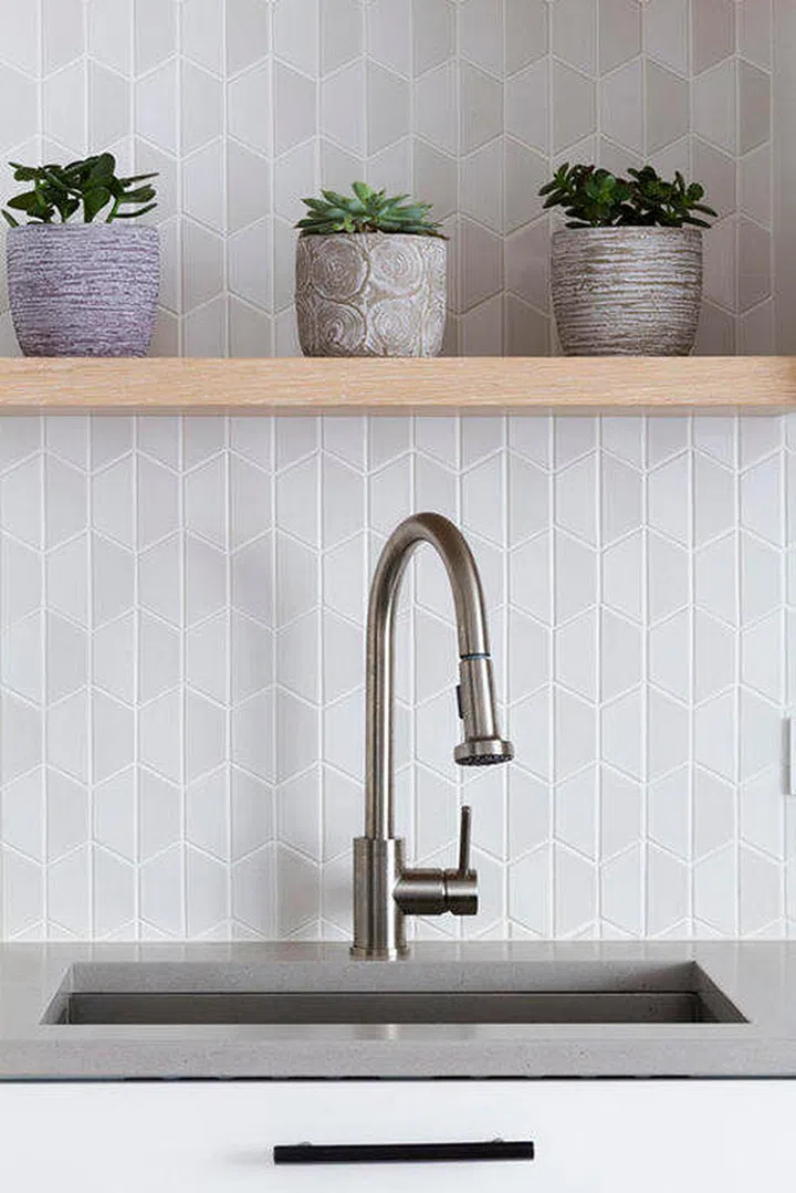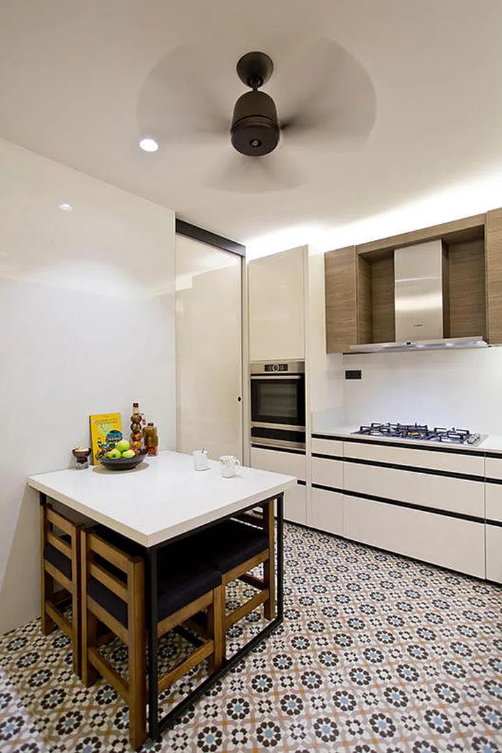 Designer Lee May Anne from Makk Architects used patterned tiles to add depth and visual texture to this simple contemporary kitchen.