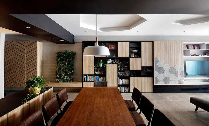 This home's geometric feature wall is accented with a timeless shade of rose gold, to complement its classic blue-brown colour scheme.