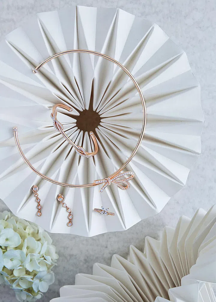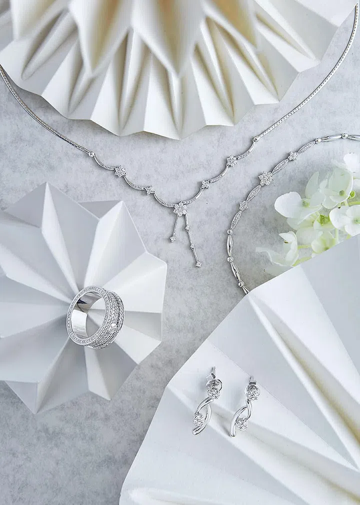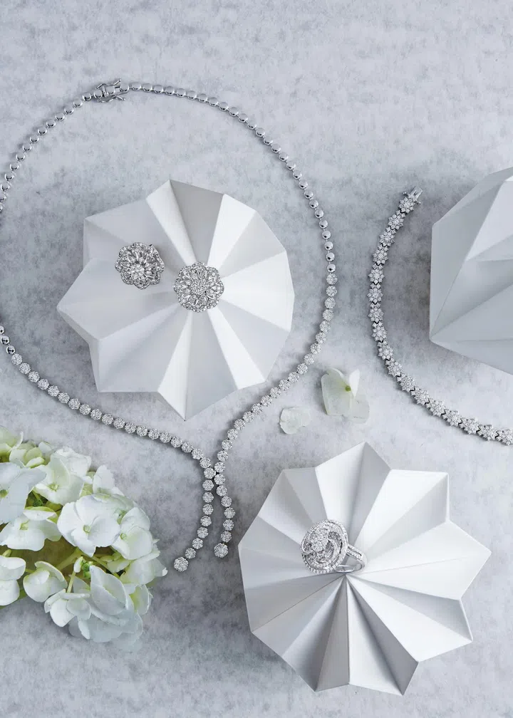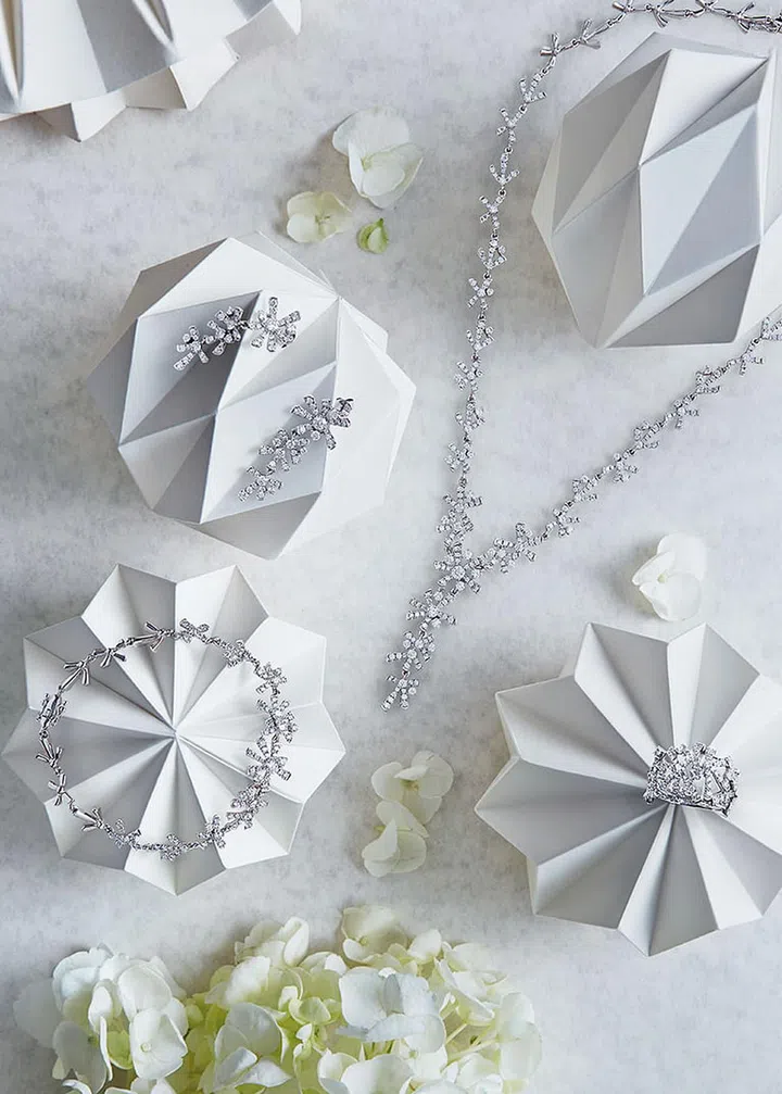 From left: Lustria 18K white gold diamond necklace, diamond earrings, diamond ring and diamond bracelet, prices upon enquiry, from SOOKEE JEWELLERY. Origami sculptures (throughout) by Melvin Ong, from DESINERE.