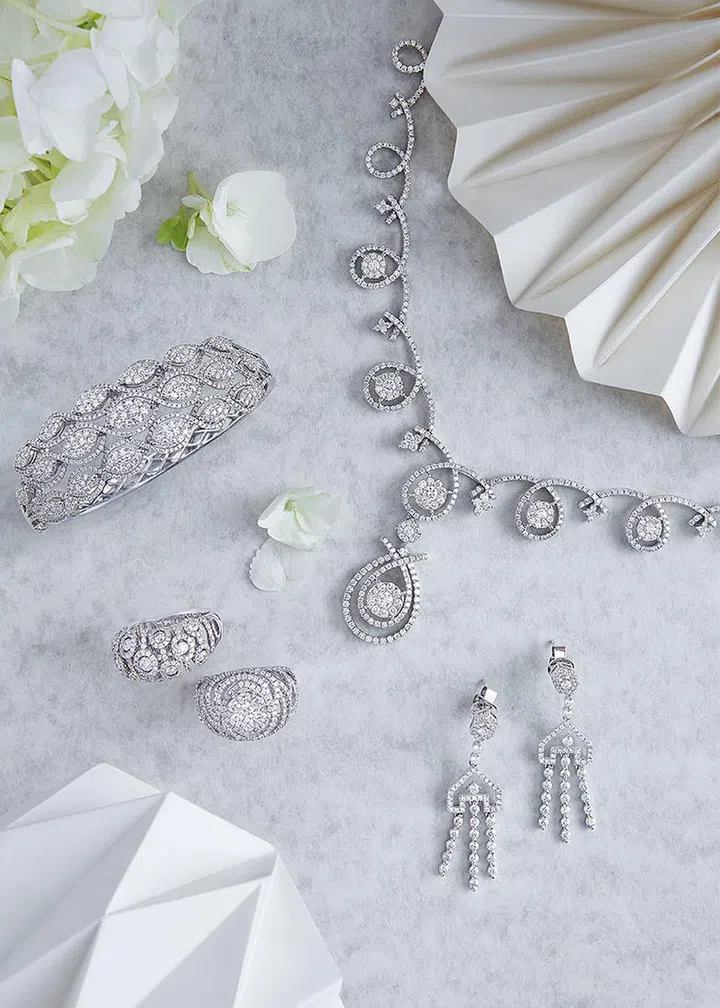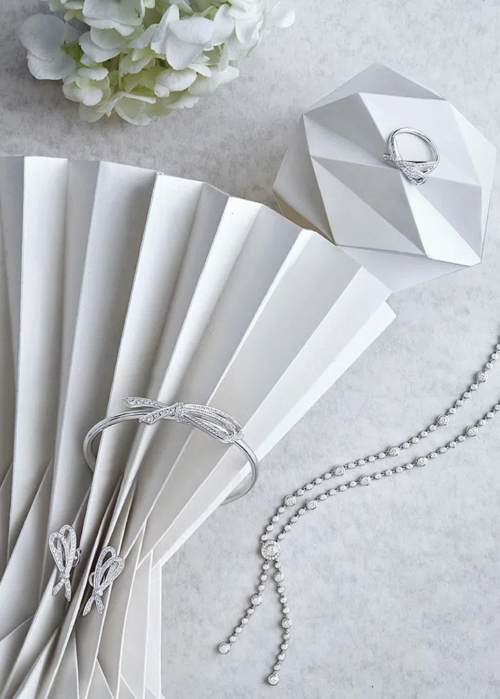 From top: Destinee Faie white gold necklace, earrings, bracelet and ring with Destinee diamonds, prices upon enquiry, from LEE HWA JEWELLERY.