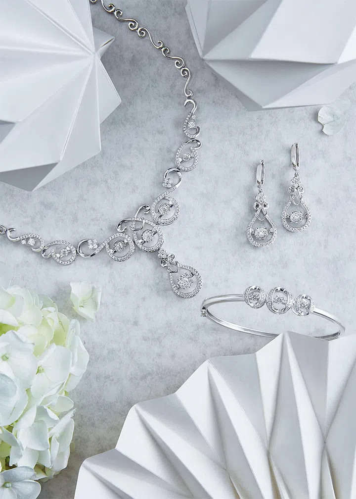From top: 18K white gold diamond necklace, $26,999, 18K white gold diamond earrings, $7,999, and 14K white gold diamond bangle, $2,399, from SK JEWELLERY.