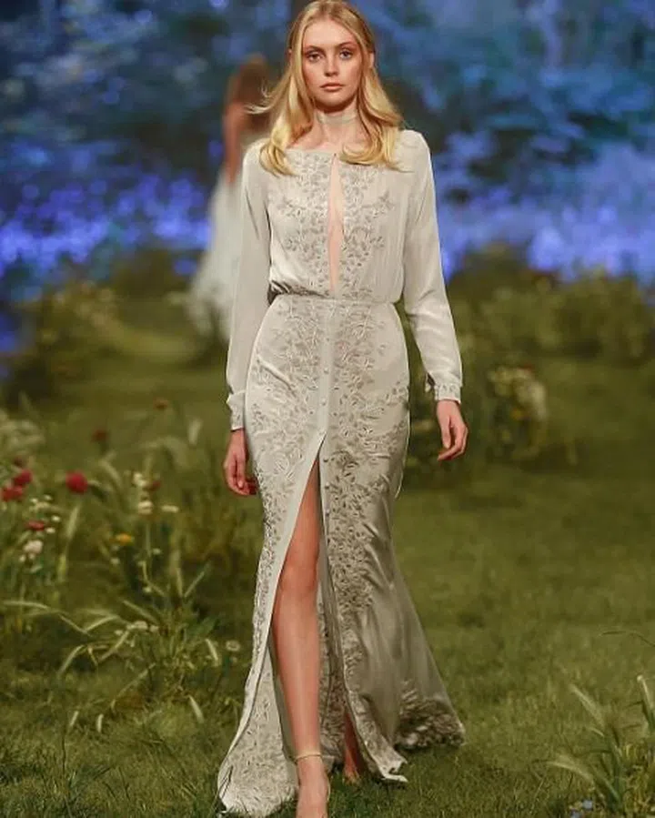 Looking for something appropriate for religious ceremonies and after? This flowy gown with long sleeves featuring cut-work embroidery and button detailing by Paolo Sebastian is a lovely option.