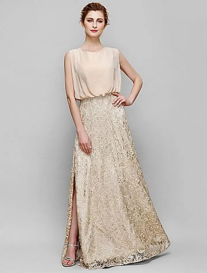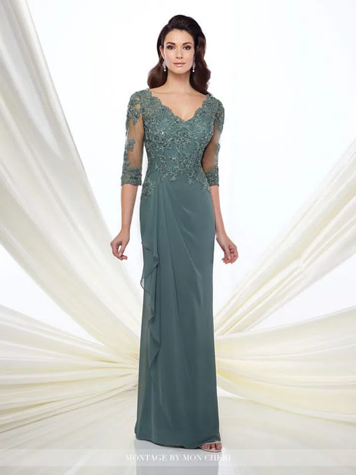 If you're thinking of going matchy-matchy with mum, this glamorous teal gown from Mon Cheri featuring illusion sleeves and a lace bodice is perfect.