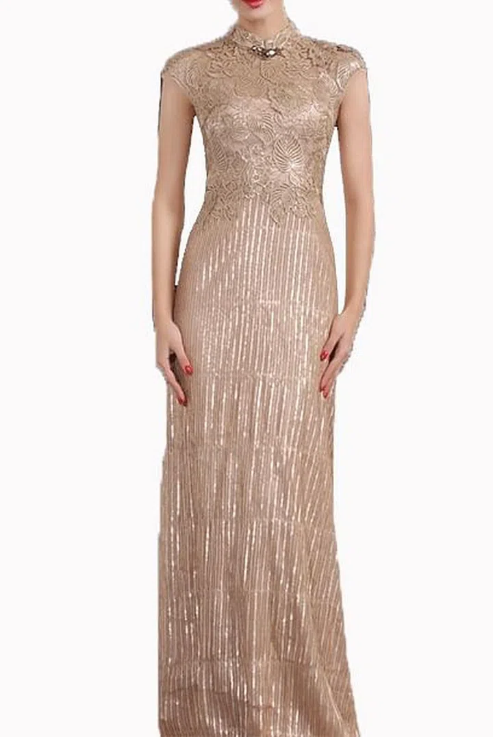 For a more modern take on the traditional cheongsam, this glamorous peach or rose gold cheongsam checks all the right boxes.