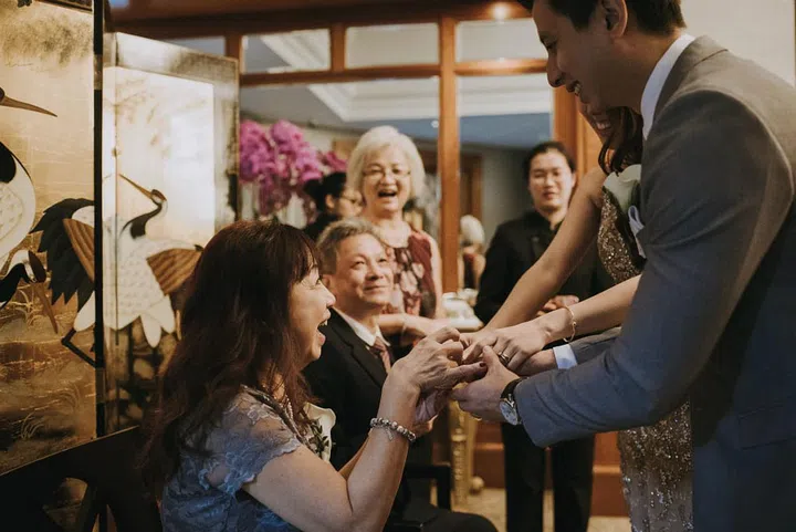 "Jiaming proposed to me on Christmas Eve six years after we’d gotten together. After a picnic on the beach at Pulau Palawan, he led me to the southernmost point of the islet that had been beautifully lit. To my surprise, he got on one knee with a speech, and as soon as I accepted, our families as well as friends, who appeared from out of nowhere, started cheering us on."