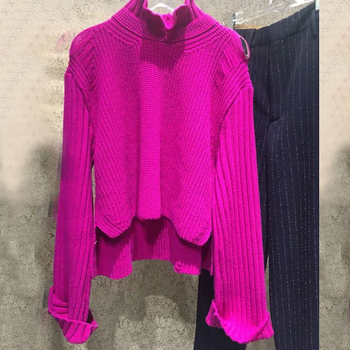 The smart money's on this bright fuchsia sweater making it onto everyone’s holiday wish list this year. It looks super snug; fitting for the winter holidays. It’s definitive winning trait is its oversized, stretched out sleeves. That, alongside distressed knit detailings along the shoulder and the ruched-up mock neck, renders this end-year staple as a must-have in our books.
